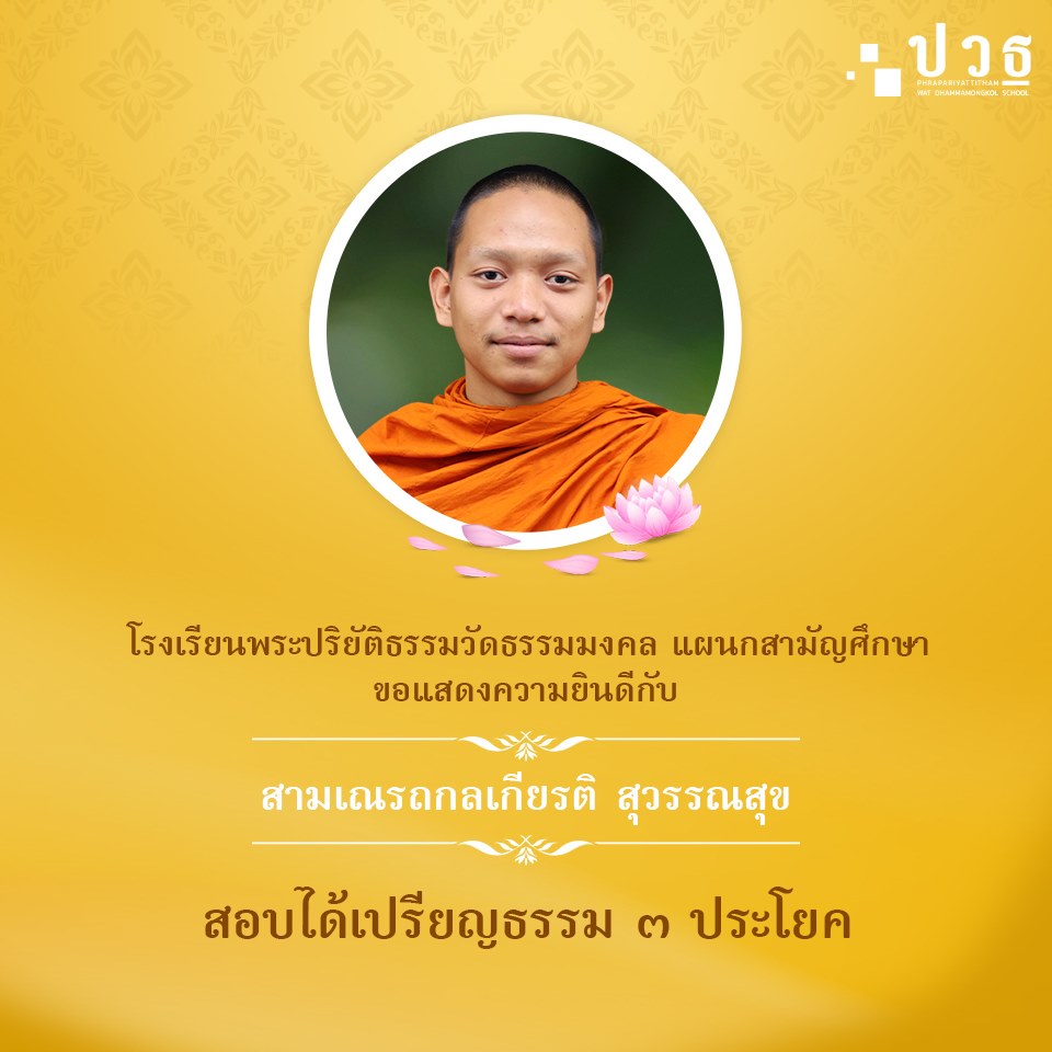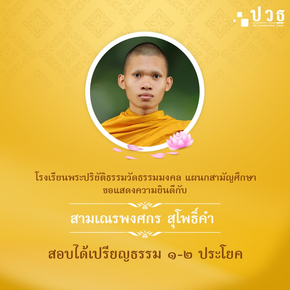 โรงเรียนพระปริยัติธรรมวัดธรรมมงคล แผนกสามัญศึกษา ขอแสดงความยินดีกับสามเณรสอบได้เปรียญธรรมประจำปี พ.ศ. ๒๕๖๓ สำนักเรียนวัดธรรมมงคลเถาบุญญนนท์วิหาร ได้แก่ สามเณรวรวุฒิ แซ่เตีย สอบได้เปรียญธรรม ๕ ประโยค -------------------------------------- สามเณรถกลเกียรติ สุวรรณสุข สอบได้เปรียญธรรม ๓ ประโยค ------------------------------------- สามเณรพงศกร สุโพธิ์คำ สอบได้เปรียญธรรม ๑-๒ ประโยค |